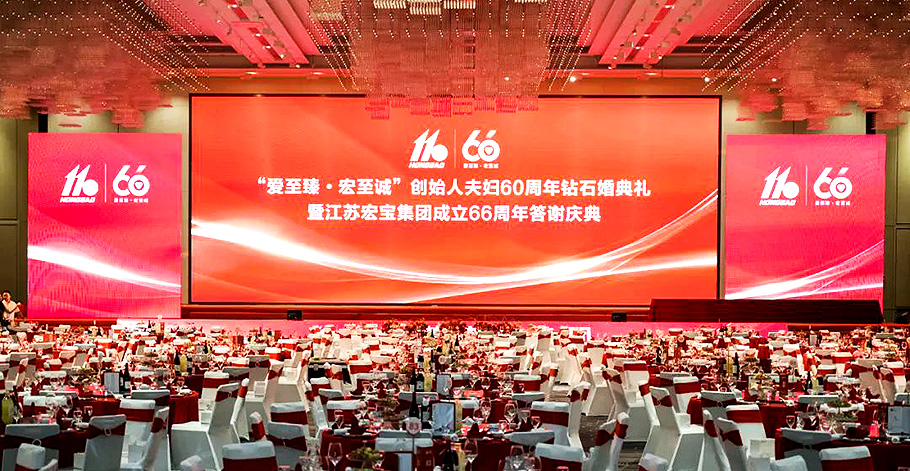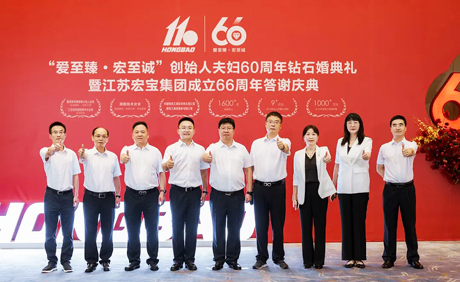 2024年9月20日,江蘇宏寶集團公司迎來了建廠66周年,恰逢創始人朱玉寶夫婦結婚60周年紀念日。“愛至臻·宏至誠”創始人夫婦60周年鉆石婚典禮暨江蘇宏寶集團成立66周年答謝慶典隆重舉行。來自社會各界友人、宏寶集團中層以上干部及家屬和員工代表們歡聚一堂,共襄盛典。