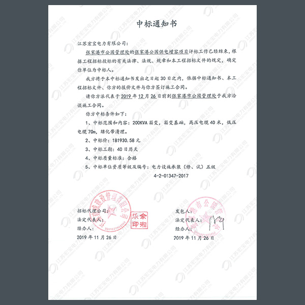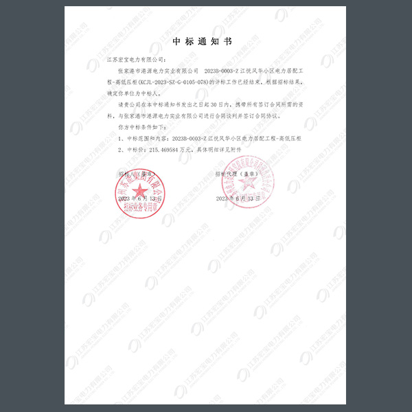 高低壓柜中標(biāo)通知書