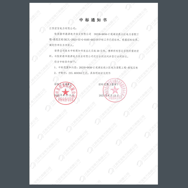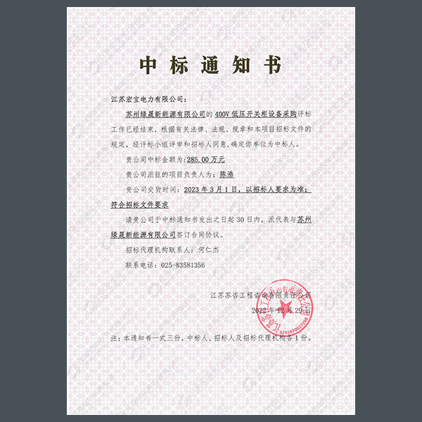 低壓柜中標(biāo)通知書